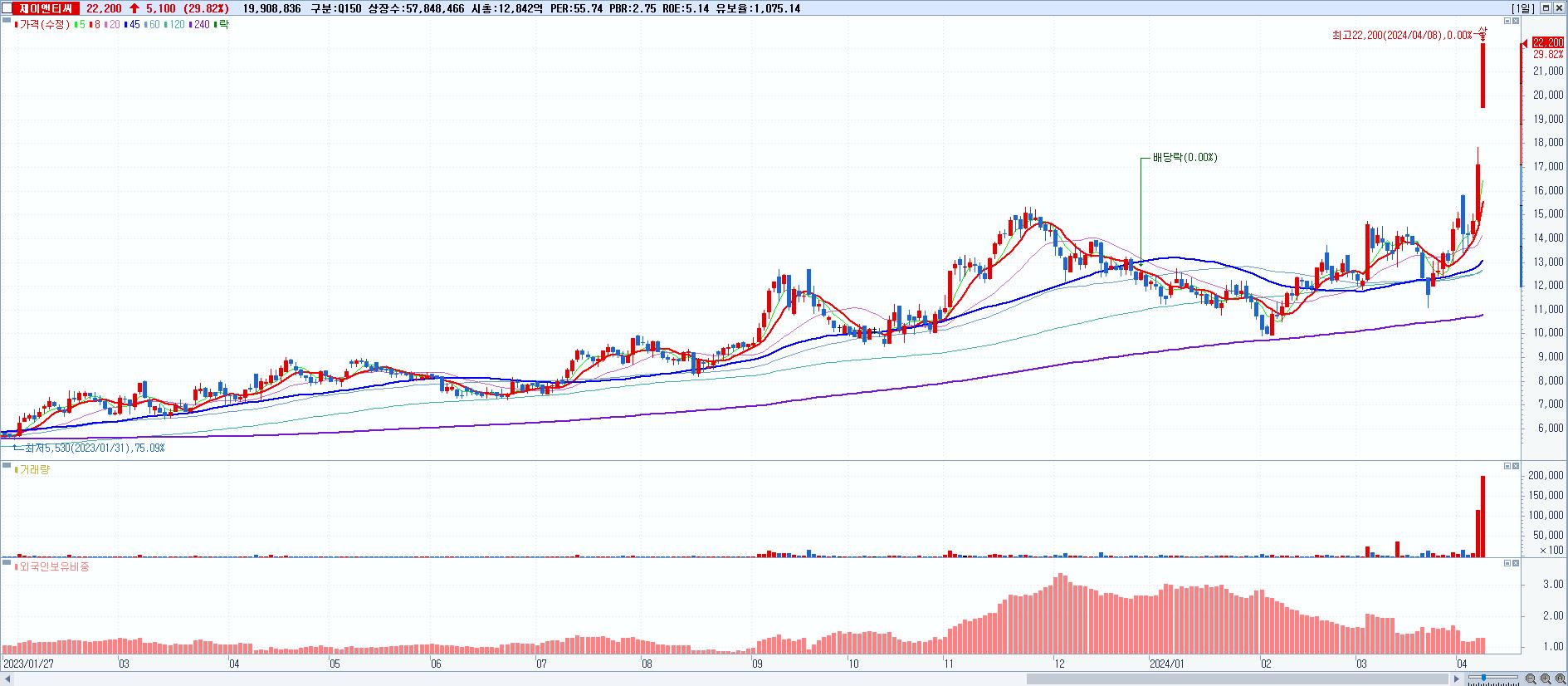 - 제이앤티씨 (22,200원 ▲ 29.82% , 시총: 12,842억, 거래량: 19,908,836, 거래대금:4,226억)