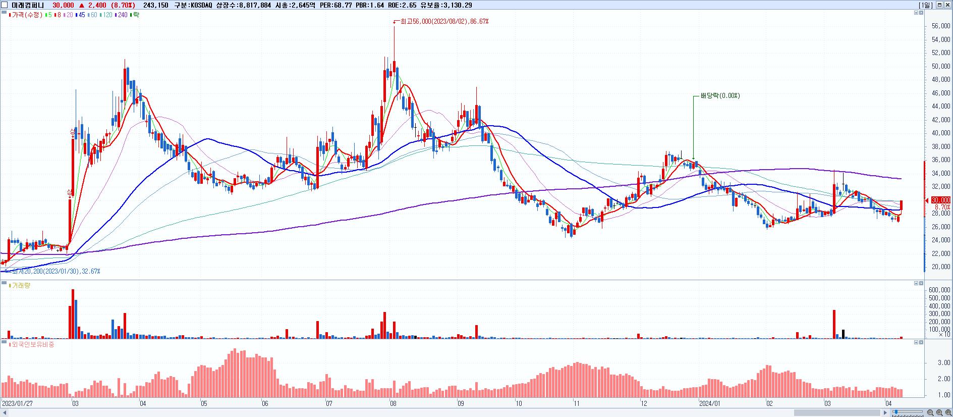 - 미래컴퍼니 (30,000원 ▲ 8.7% , 시총: 2,645억, 거래량: 243,150, 거래대금:71억)