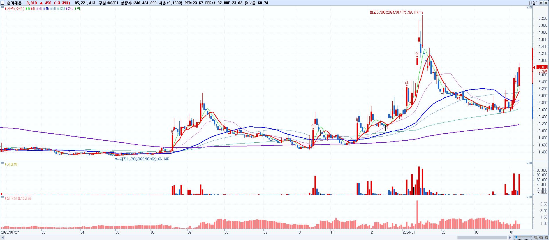 - 흥아해운 (3,810원 ▲ 13.39% , 시총: 9,160억, 거래량: 85,221,413, 거래대금:3,190억)