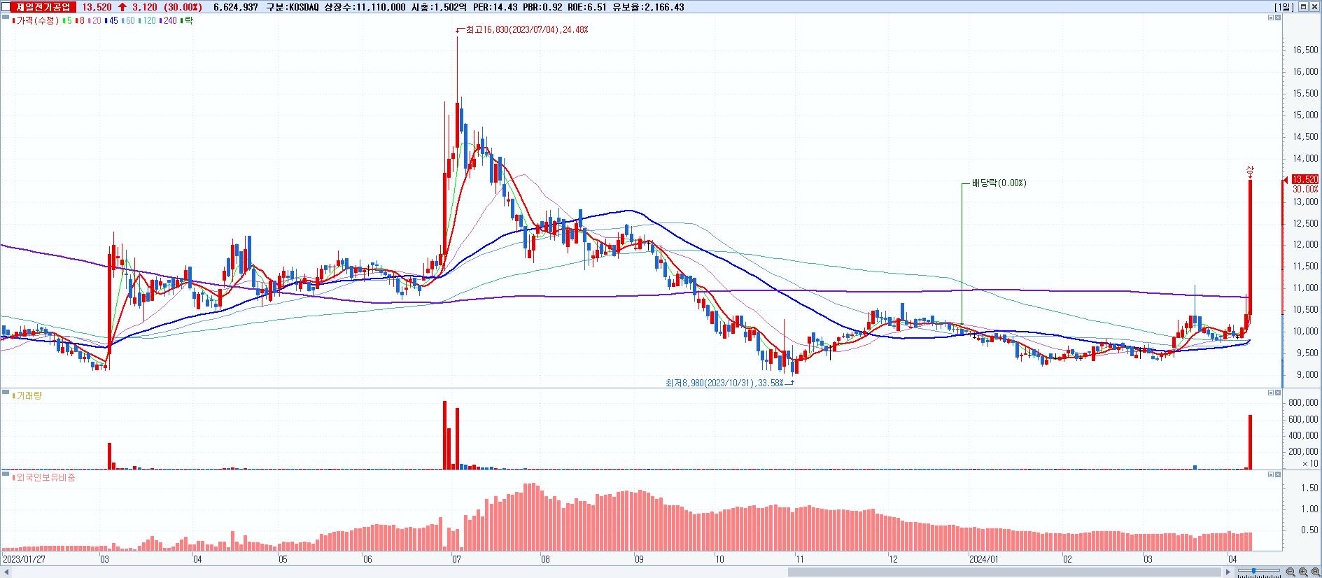 - 제일전기공업 (13,520원 ▲ 30% , 시총: 1,502억, 거래량: 6,624,937, 거래대금:842억)