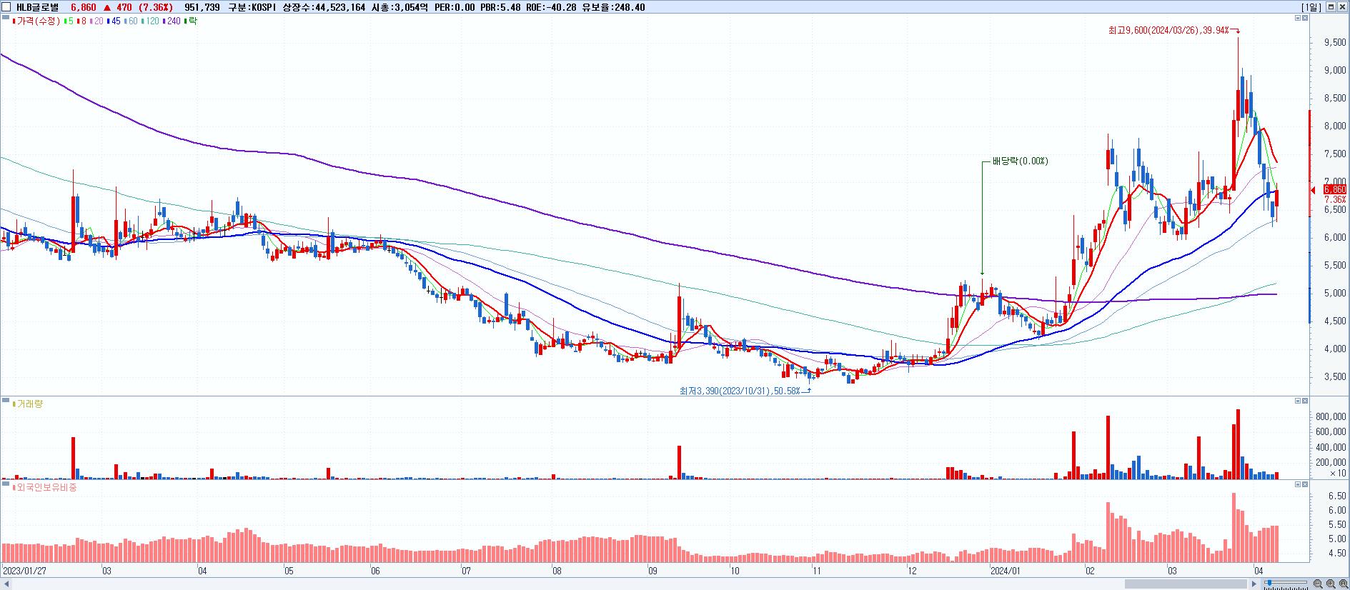 - HLB (92,900원 ▲ 7.9% , 시총: 121,541억, 거래량: 3,986,236, 거래대금:3,650억)