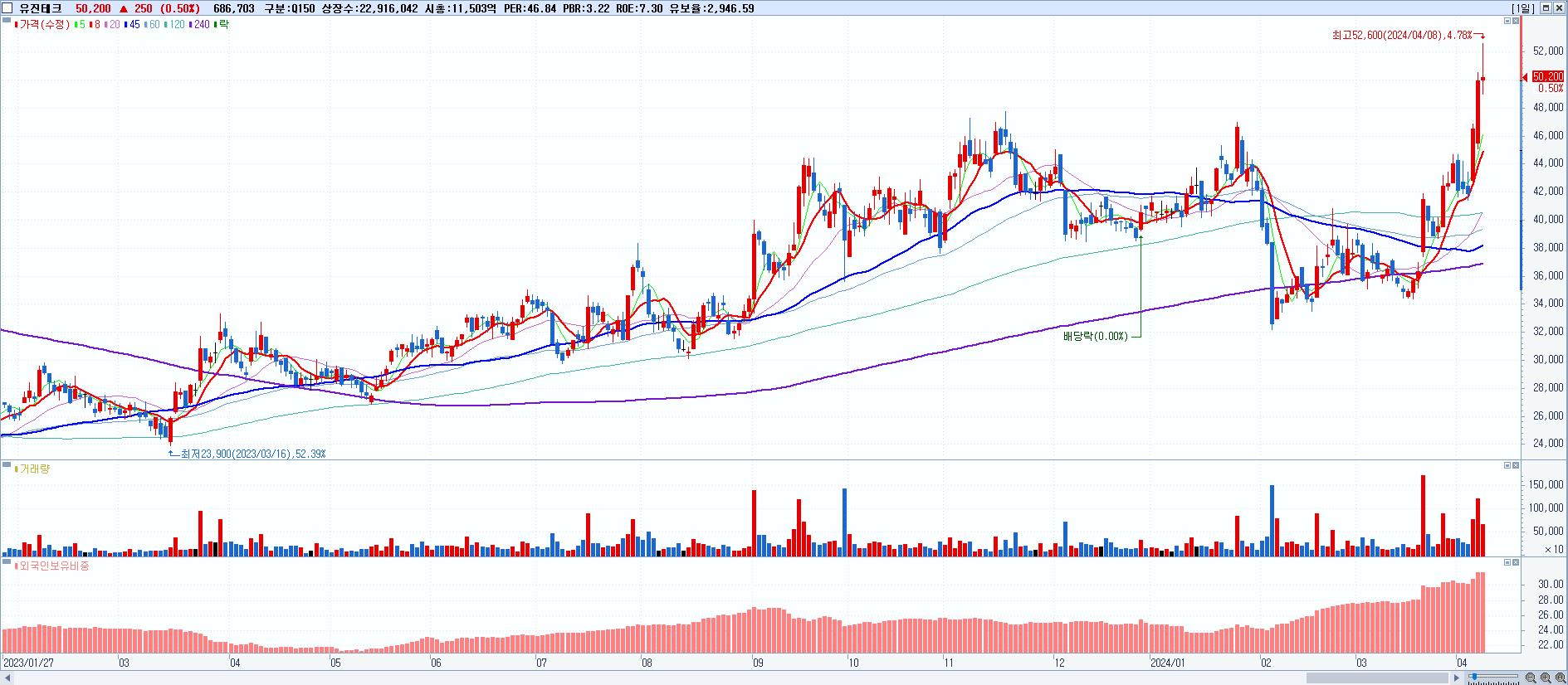 - 유진테크 (50,200원 ▲ 0.5% , 시총: 11,504억, 외국인 순매수 거래금:53억)