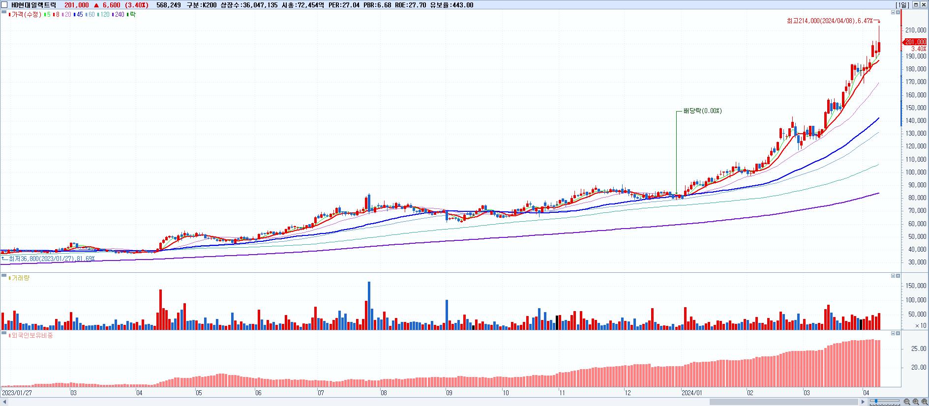 - HD현대일렉트릭 (201,000원 ▲ 3.4% , 시총: 72,455억, 외국인 순매수 거래금:191억)