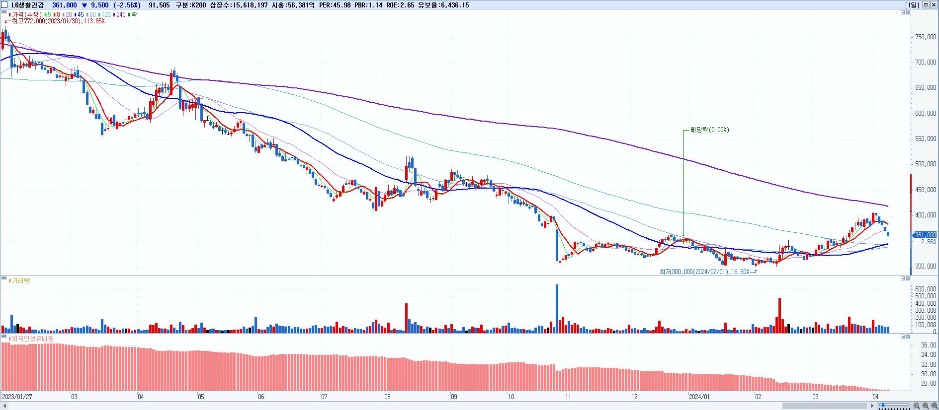 - LG생활건강 (361,000원 ▼ -2.56% , 시총: 56,382억, 외국인 순매수 거래금:45억)
