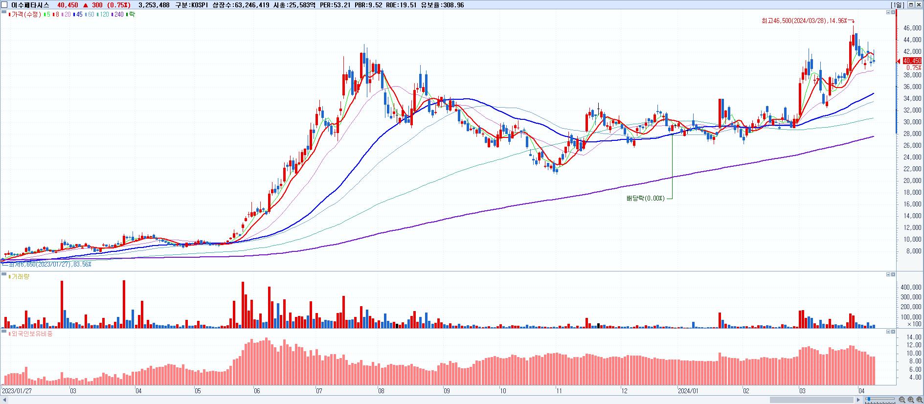 - 이수페타시스 (40,450원 ▲ 0.75% , 시총: 25,583억, 외국인 순매수 거래금:103억)