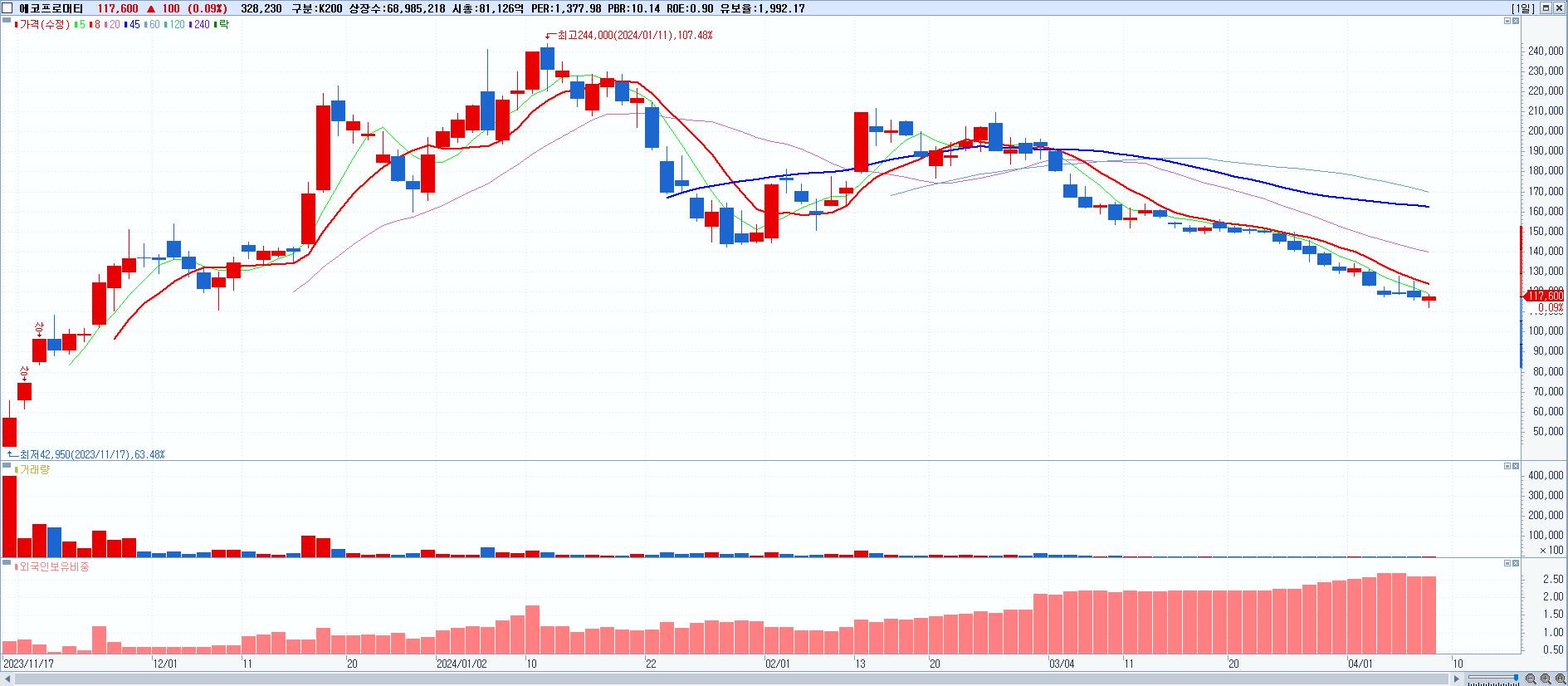 - 에코프로머티 (117,600원 ▲ 0.09% , 시총: 81,127억, 외국인 순매수 거래금:35억)