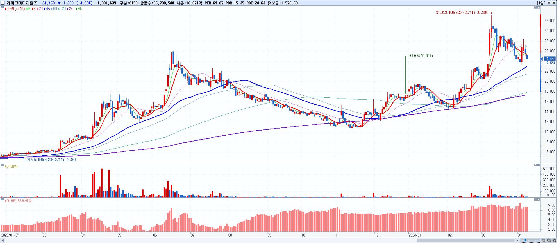 - 레이크머티리얼즈 (24,450원 ▼ -4.68% , 시총: 16,071억, 외국인 순매수 거래금:63억)