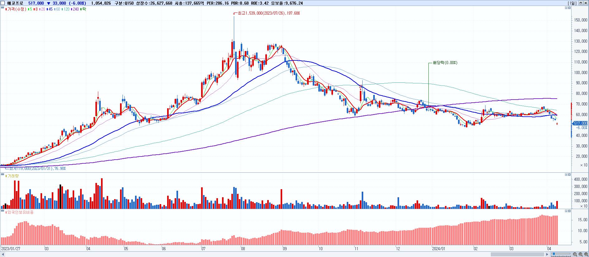 - 에코프로 (517,000원 ▼ -6% , 시총: 137,665억, 외국인 순매수 거래금:141억)