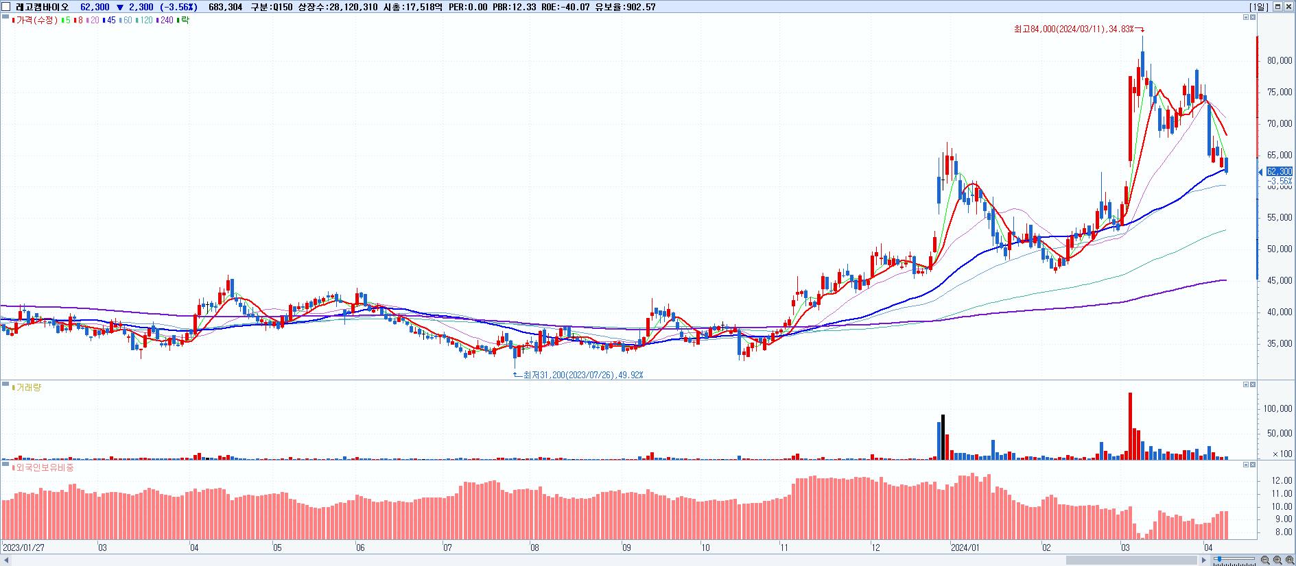 - 레고켐바이오 (62,300원 ▼ -3.56% , 시총: 17,519억, 외국인 순매수 거래금:91억)