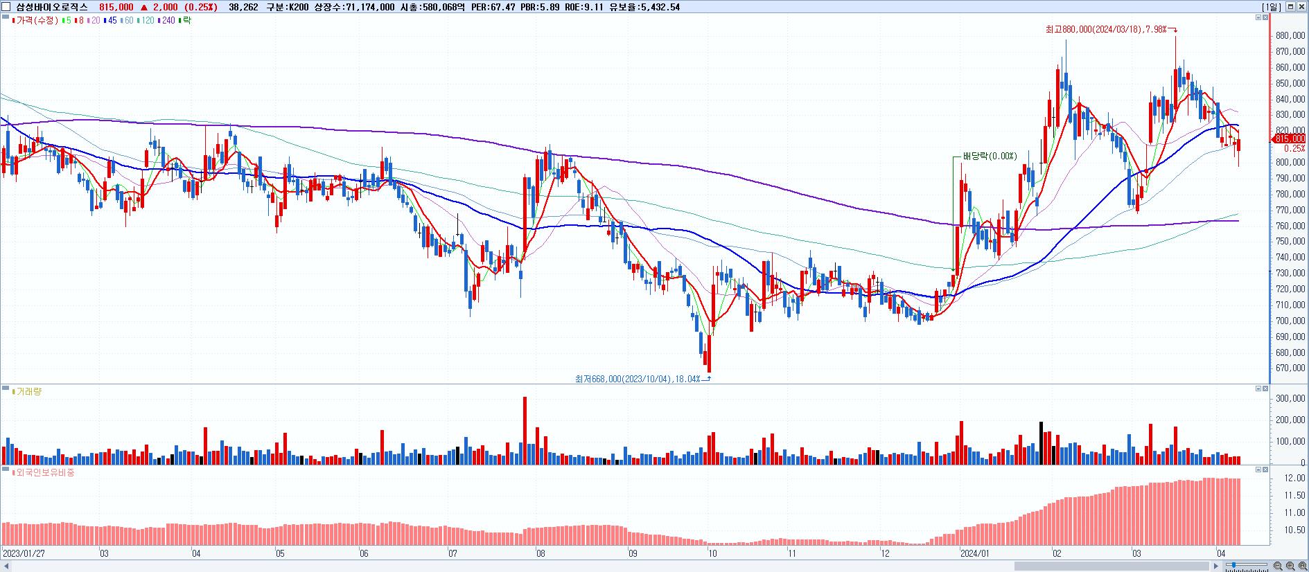 - 삼성바이오로직스 (815,000원 ▲ 0.25% , 시총: 580,068억, 외국인 순매수 거래금:59억)