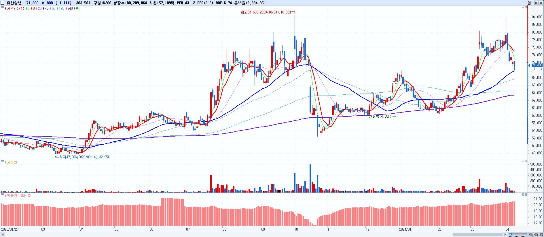 - 유한양행 (71,300원 ▼ -1.11% , 시총: 57,189억, 외국인 순매수 거래금:37억)