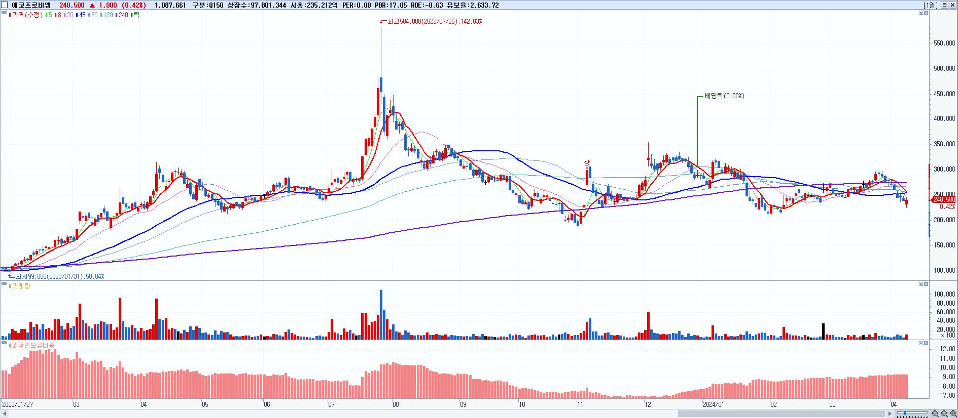 - 에코프로비엠 (240,500원 ▲ 0.42% , 시총: 235,212억, 외국인 순매수 거래금:57억)