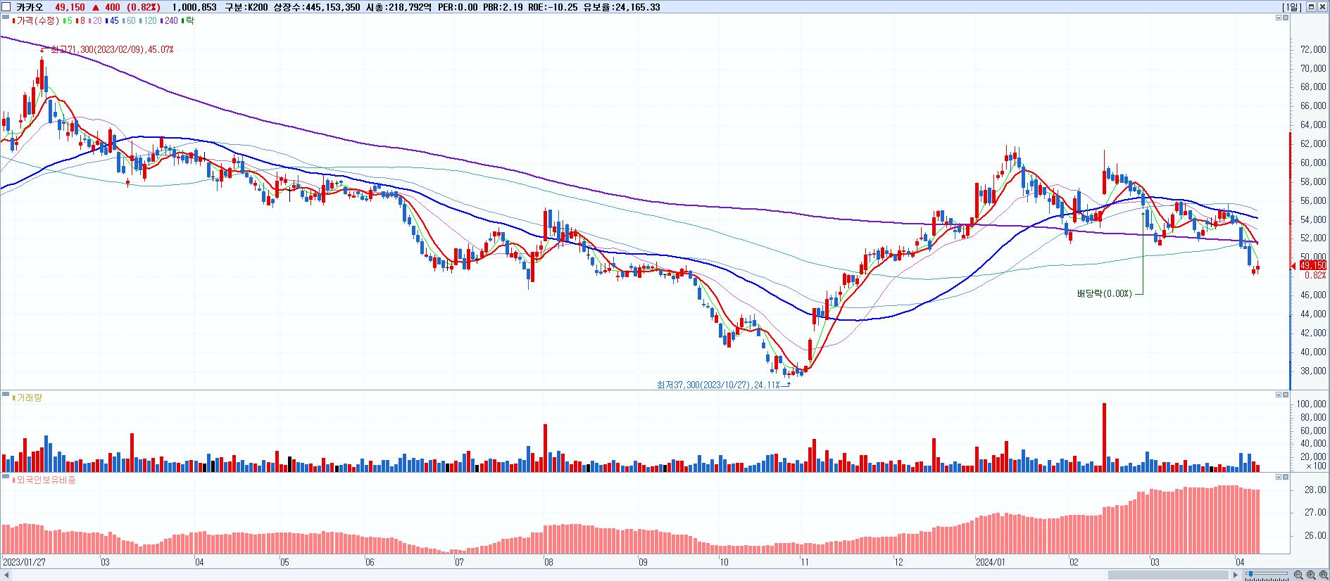 - 카카오 (49,150원 ▲ 0.82% , 시총: 218,793억, 외국인 순매수 거래금:37억)