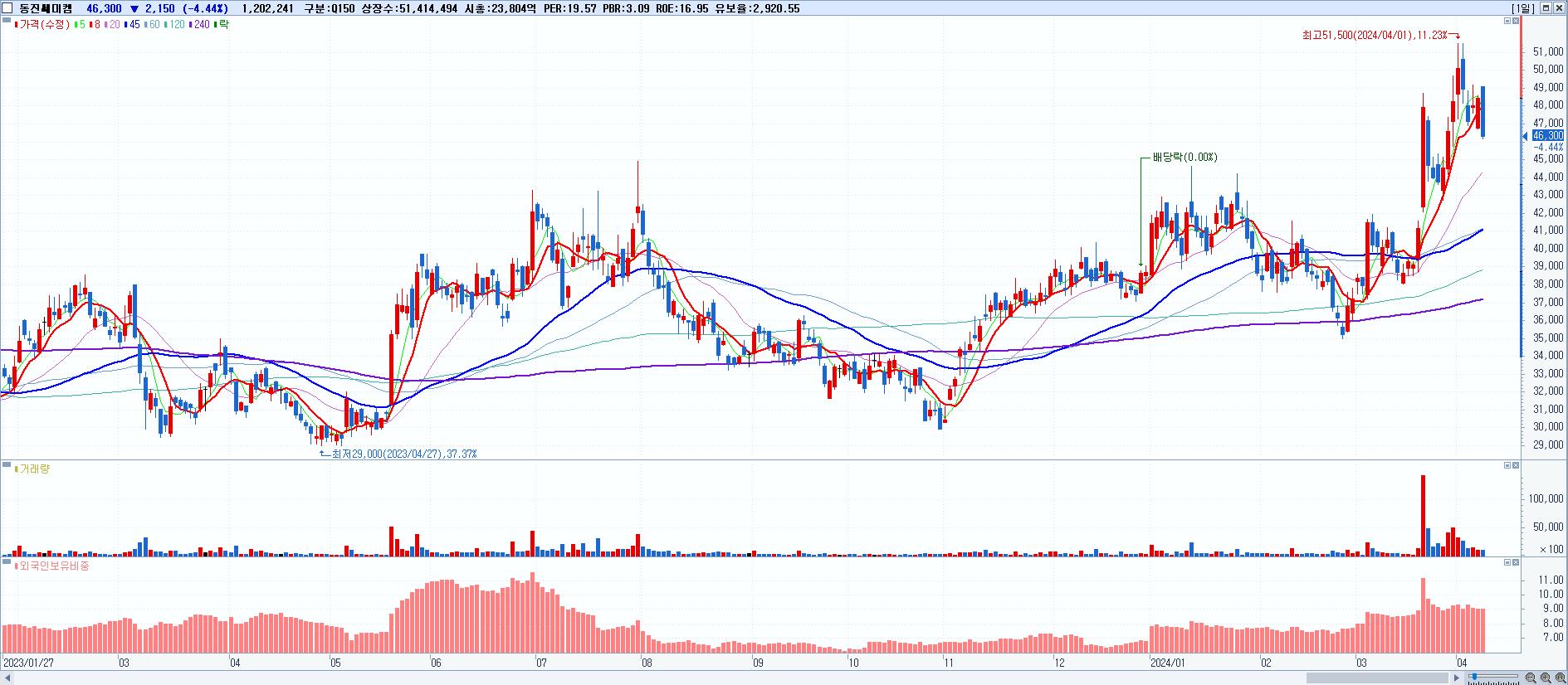 - 동진쎄미켐 (46,300원 ▼ -4.44% , 시총: 23,805억, 외국인 순매수 거래금:50억)