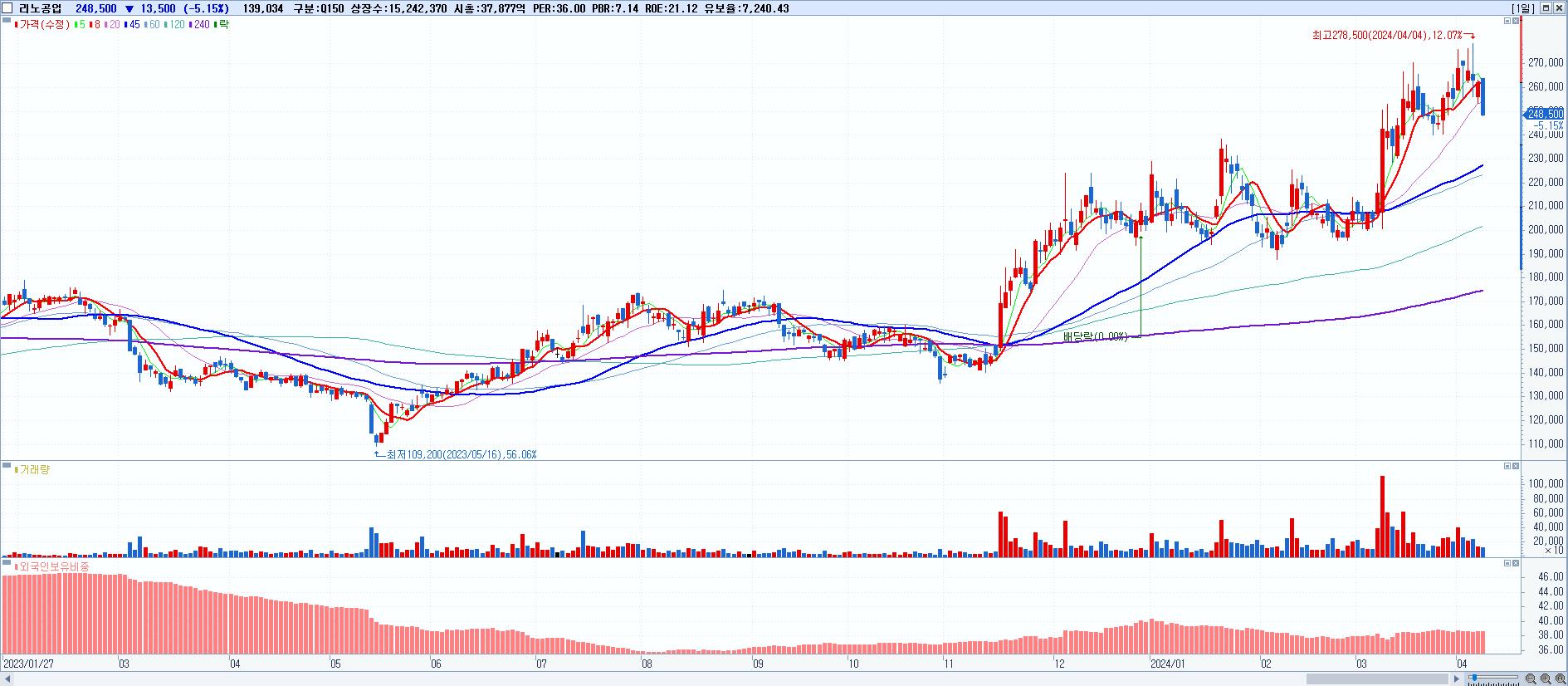 - 리노공업 (248,500원 ▼ -5.15% , 시총: 37,877억, 외국인 순매수 거래금:36억)