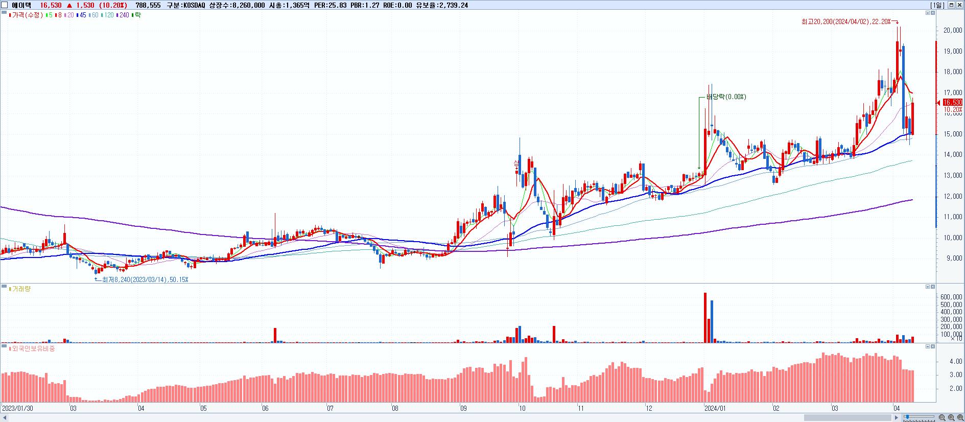 - 에이텍 (16,530원 ▲ 10.2% , 시총: 1,365억, 거래량: 788,555, 거래대금:127억)