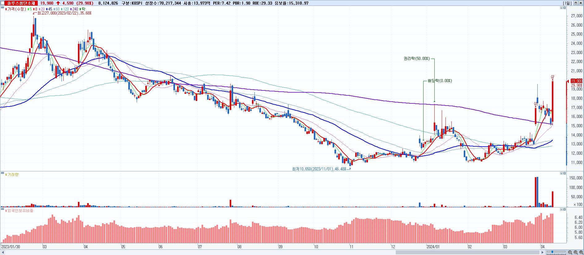 - 솔루스첨단소재 (19,900원 ▲ 29.98% , 시총: 13,973억, 거래량: 8,124,826, 거래대금:1,491억)