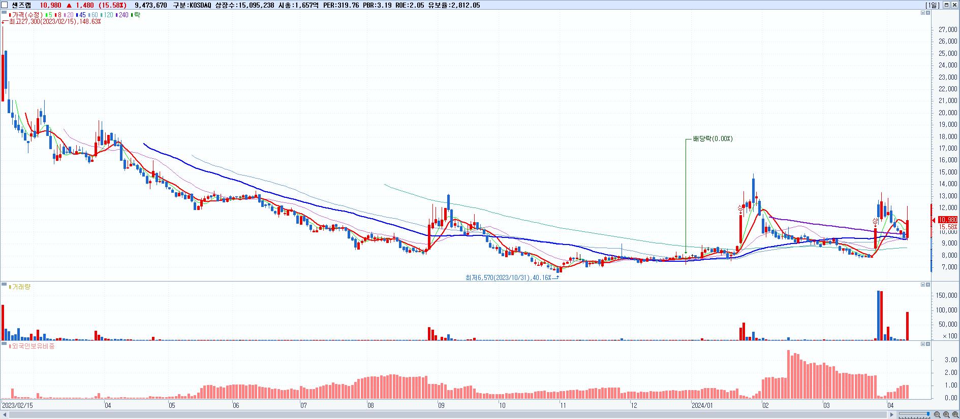 - 샌즈랩 (10,980원 ▲ 15.58% , 시총: 1,657억, 거래량: 9,473,670, 거래대금:1,069억)