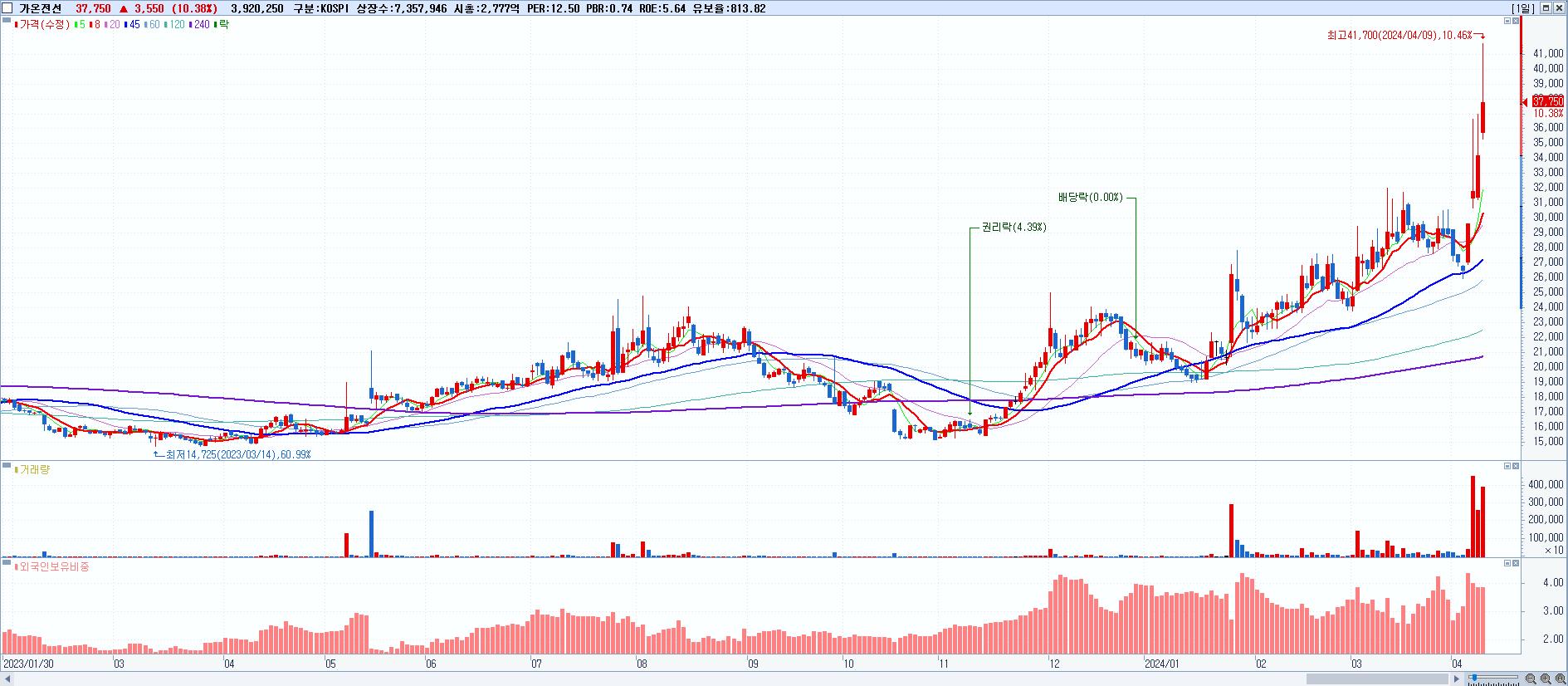 - 가온전선 (37,750원 ▲ 10.38% , 시총: 2,778억, 거래량: 3,920,250, 거래대금:1,522억)