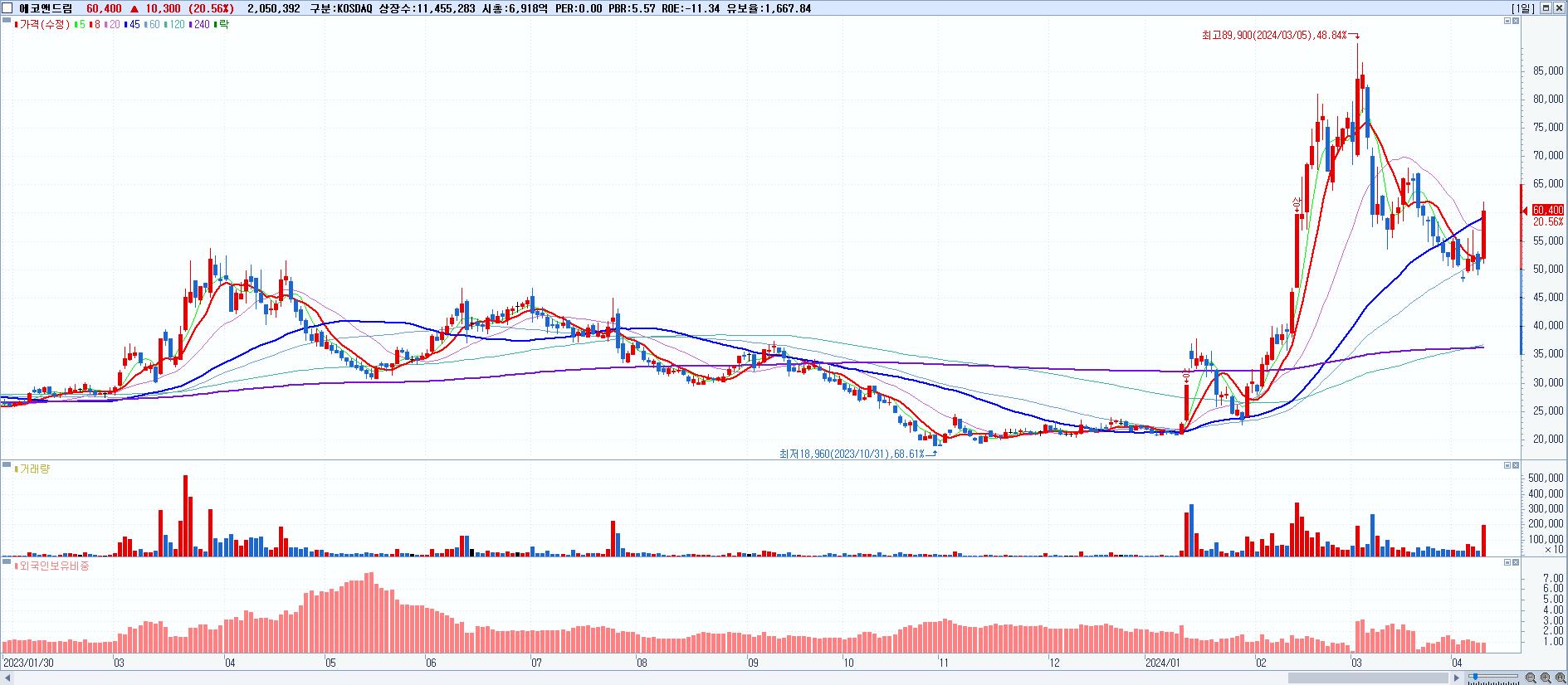 - 에코앤드림 (60,400원 ▲ 20.56% , 시총: 6,919억, 거래량: 2,050,392, 거래대금:1,202억)