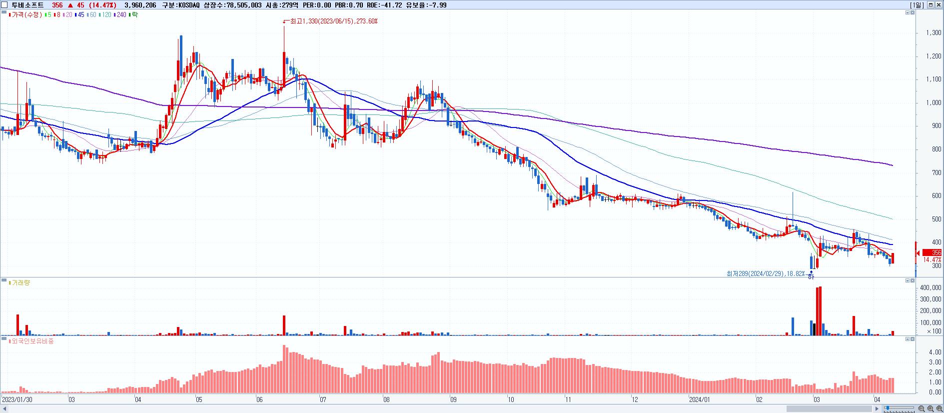- 투비소프트 (356원 ▲ 14.47% , 시총: 279억, 거래량: 3,960,206, 거래대금:13억)