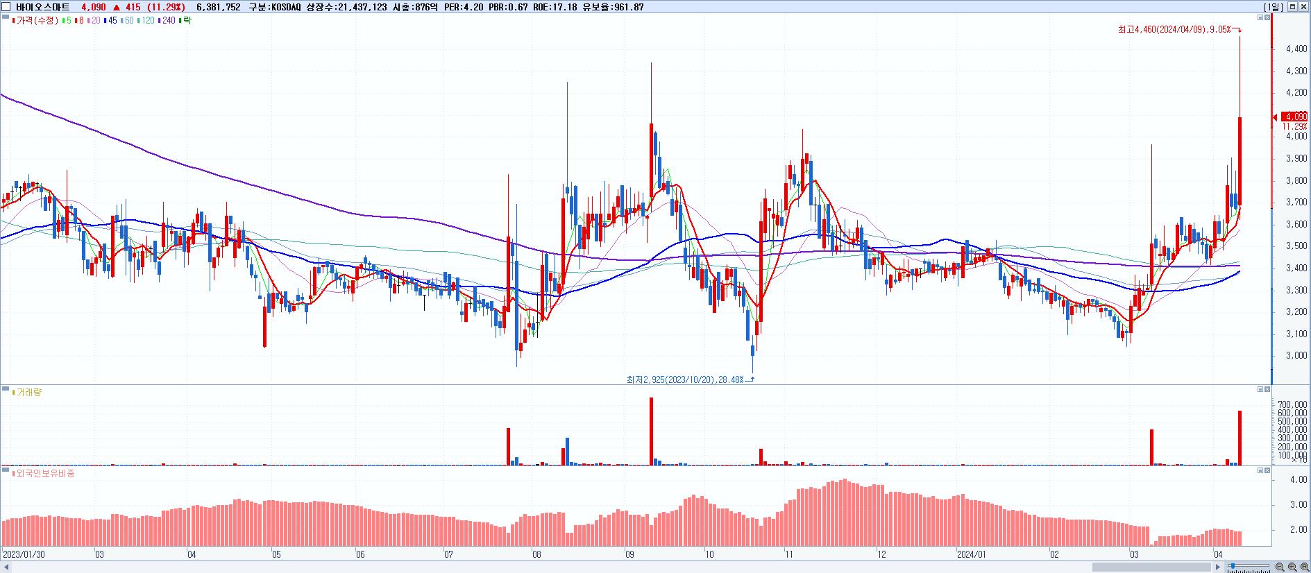- 바이오스마트 (4,090원 ▲ 11.29% , 시총: 877억, 거래량: 6,381,752, 거래대금:265억)