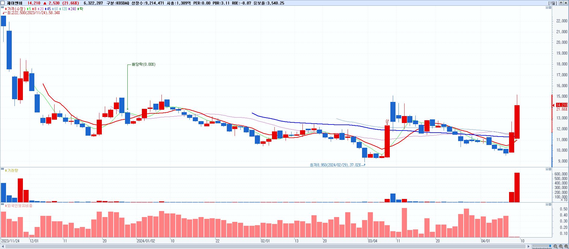 - 제이엔비 (14,210원 ▲ 21.66% , 시총: 1,309억, 거래량: 6,322,287, 거래대금:895억)