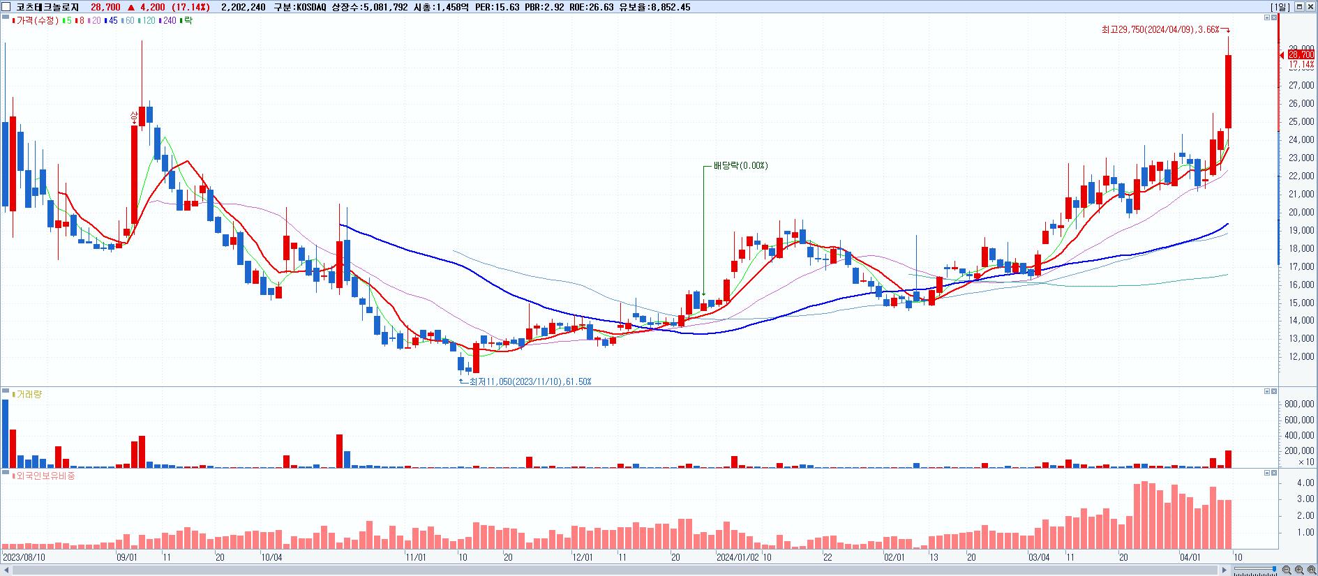- 코츠테크놀로지 (28,700원 ▲ 17.14% , 시총: 1,458억, 거래량: 2,202,240, 거래대금:611억)