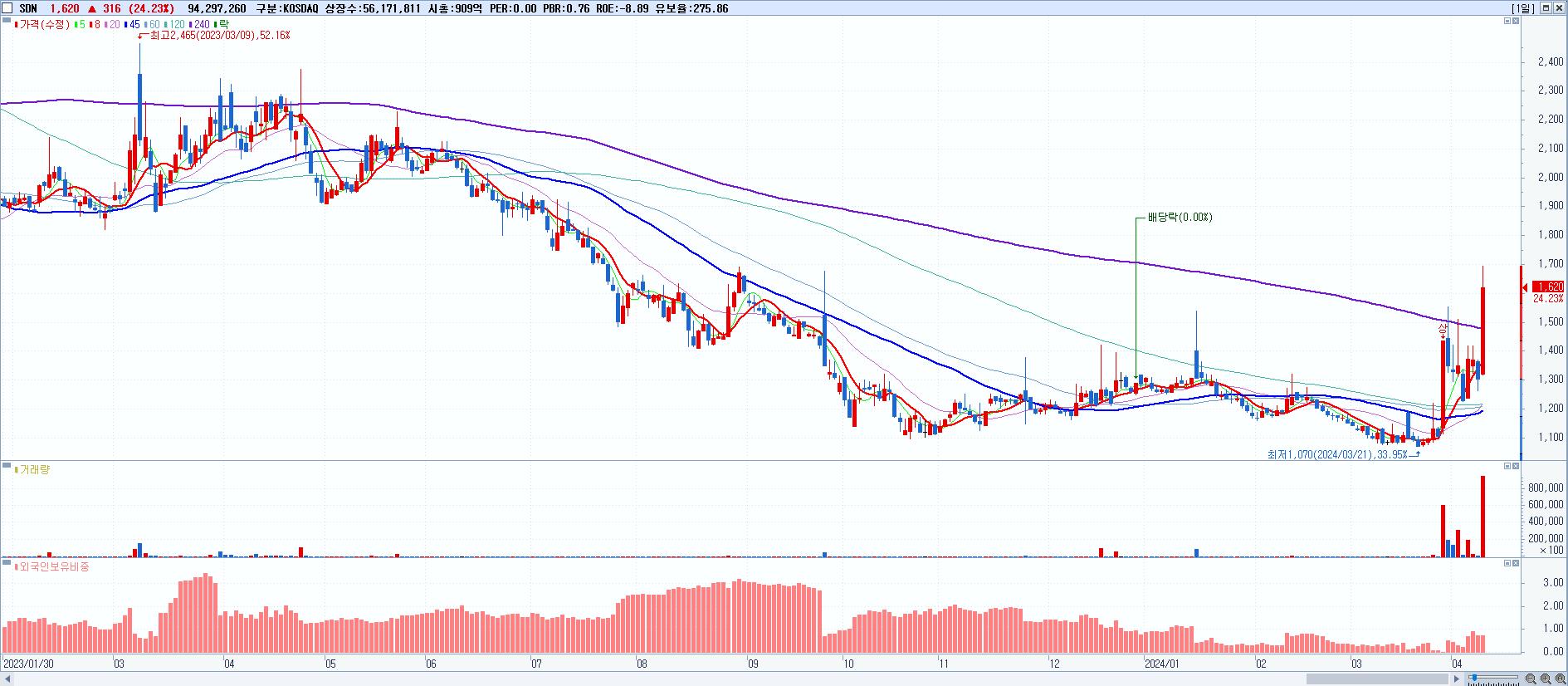 - SDN (1,620원 ▲ 24.23% , 시총: 910억, 거래량: 94,297,260, 거래대금:1,497억)