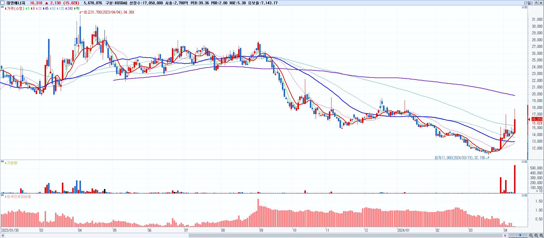 - 대명에너지 (16,310원 ▲ 15.02% , 시총: 2,781억, 거래량: 5,670,076, 거래대금:938억)