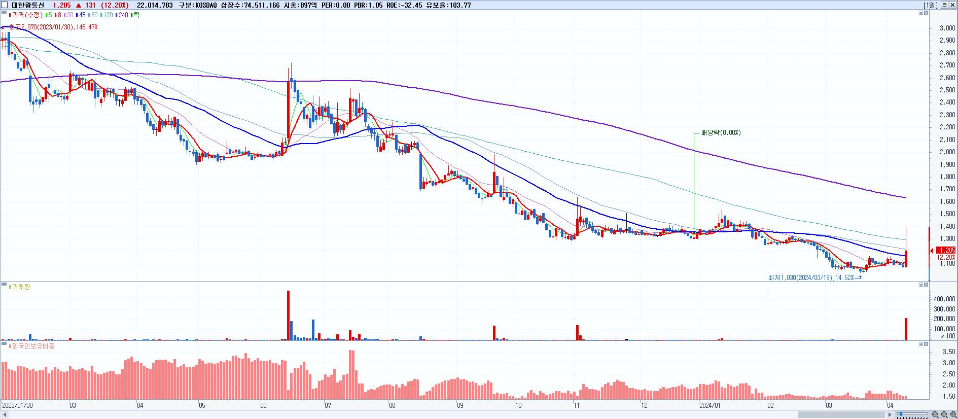 - 대한광통신 (1,205원 ▲ 12.2% , 시총: 898억, 거래량: 22,014,783, 거래대금:287억)