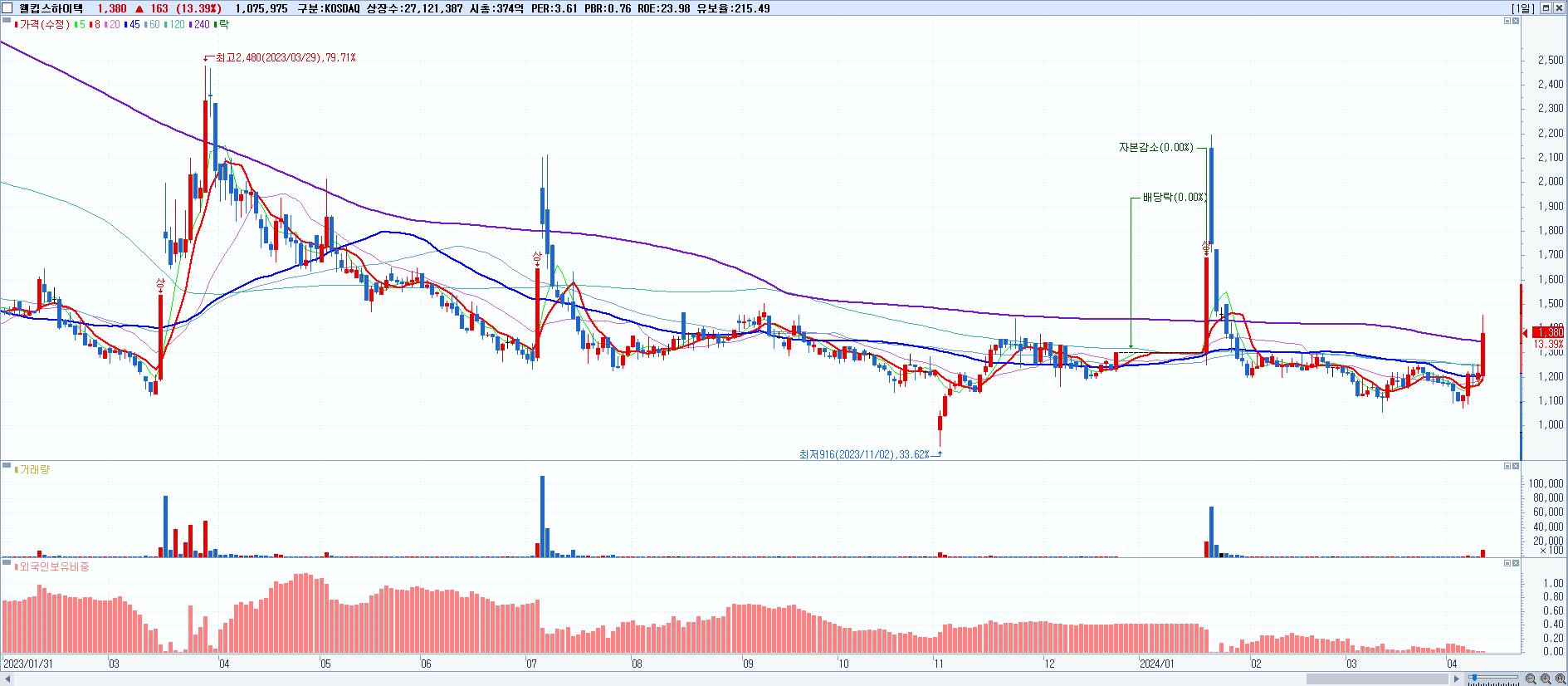 - 웰킵스하이텍 (1,380원 ▲ 13.39% , 시총: 374억, 거래량: 1,075,975, 거래대금:15억)