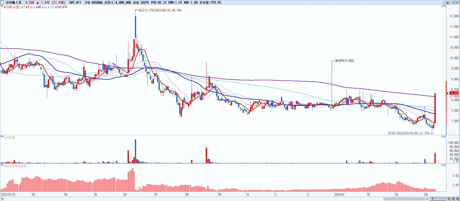 - 신라에스지 (8,330원 ▲ 21.43% , 시총: 333억, 거래량: 507,811, 거래대금:39억)