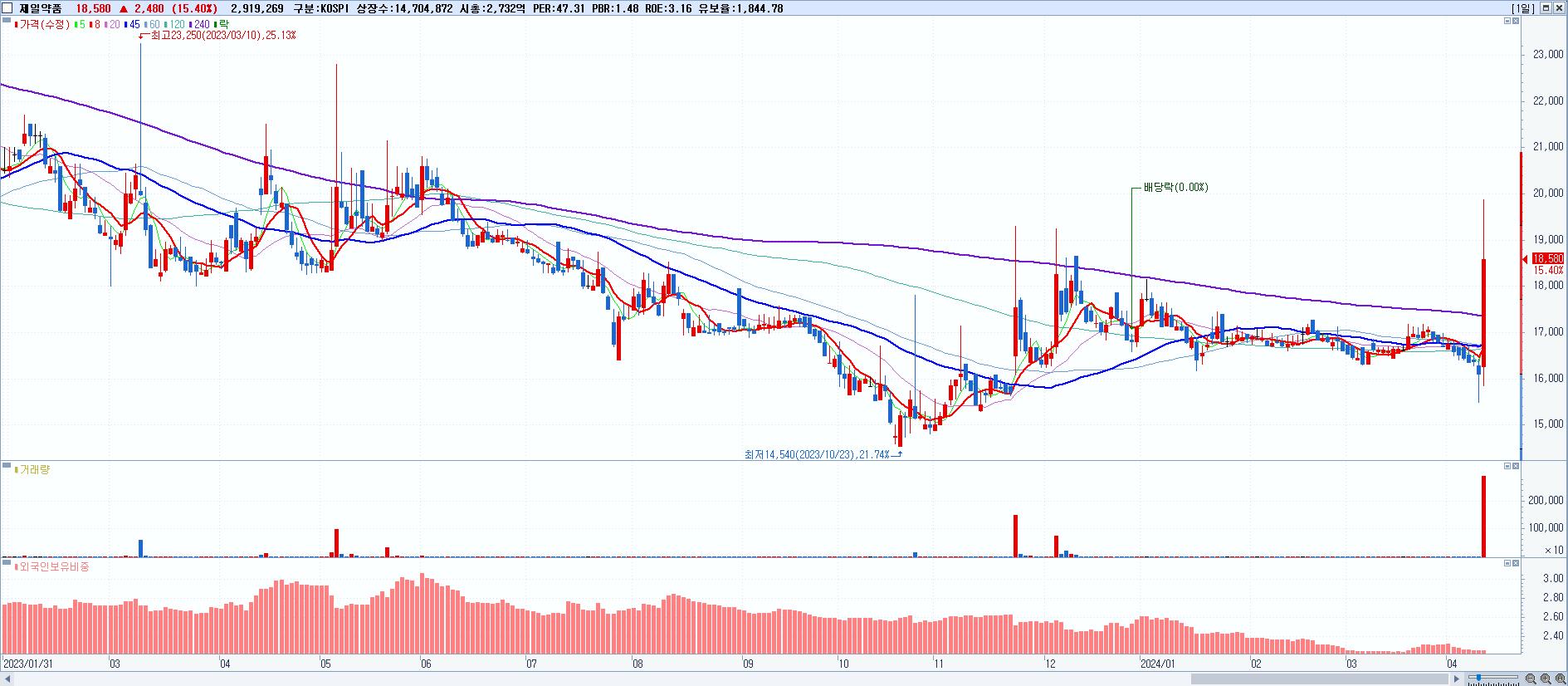 - 제일약품 (18,580원 ▲ 15.4% , 시총: 2,732억, 거래량: 2,919,269, 거래대금:554억)