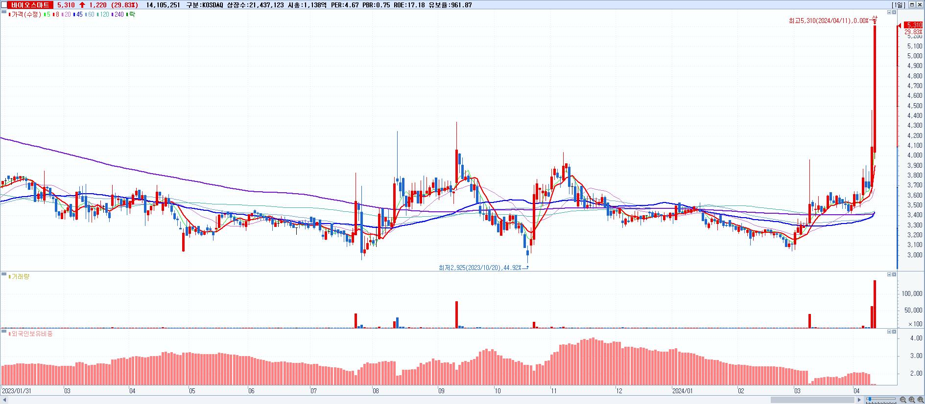 2.바이오스마트 5,310원 ▲ 29.83% (KOSDAQ, 038460)