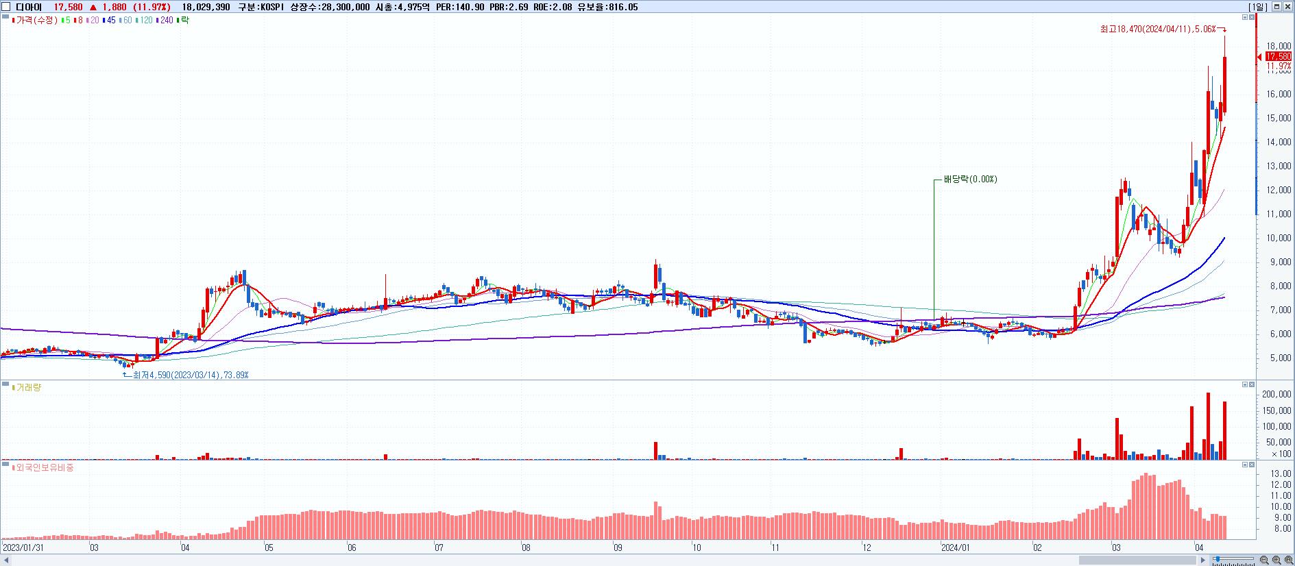 - 디아이 (17,580원 ▲ 11.97% , 시총: 4,975억, 거래량: 18,029,390, 거래대금:3,158억)