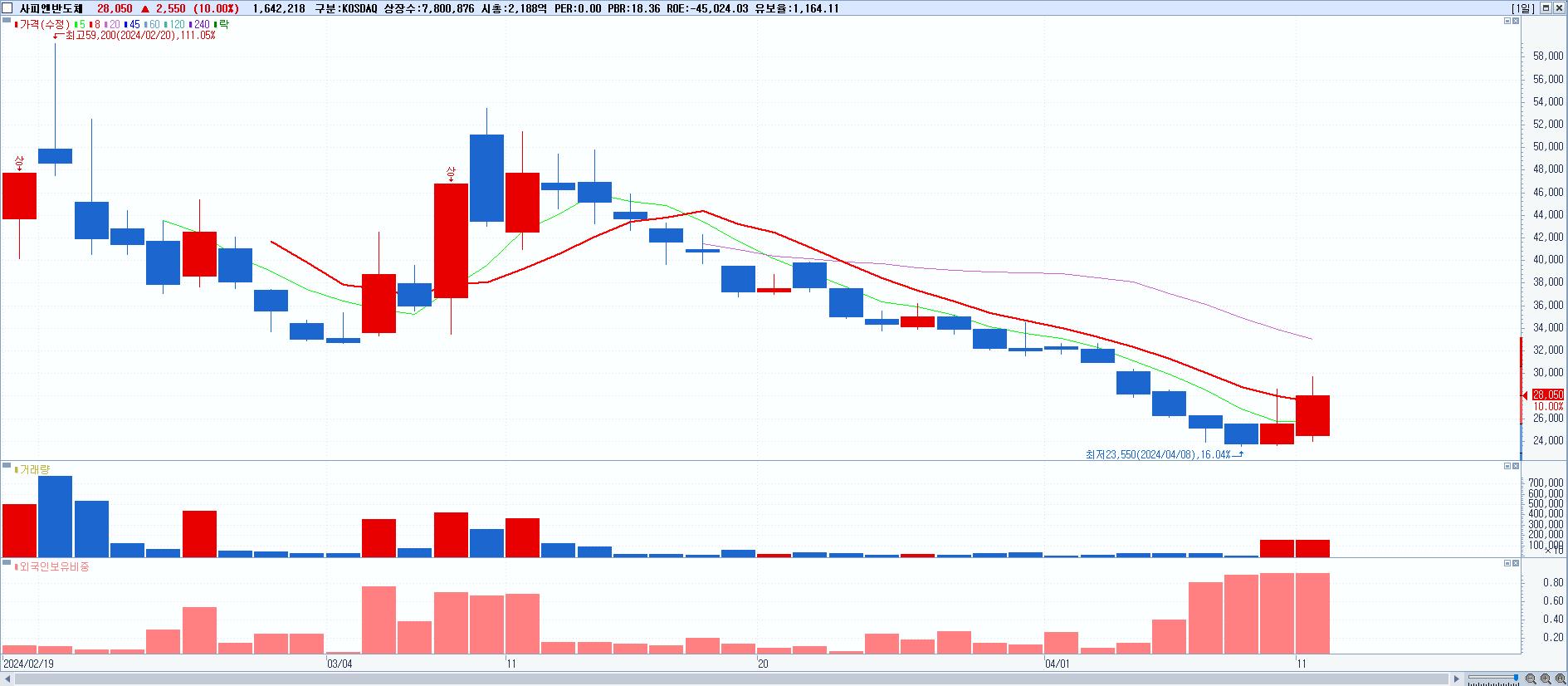 - 사피엔반도체 (28,050원 ▲ 10% , 시총: 2,188억, 거래량: 1,642,218, 거래대금:461억)
