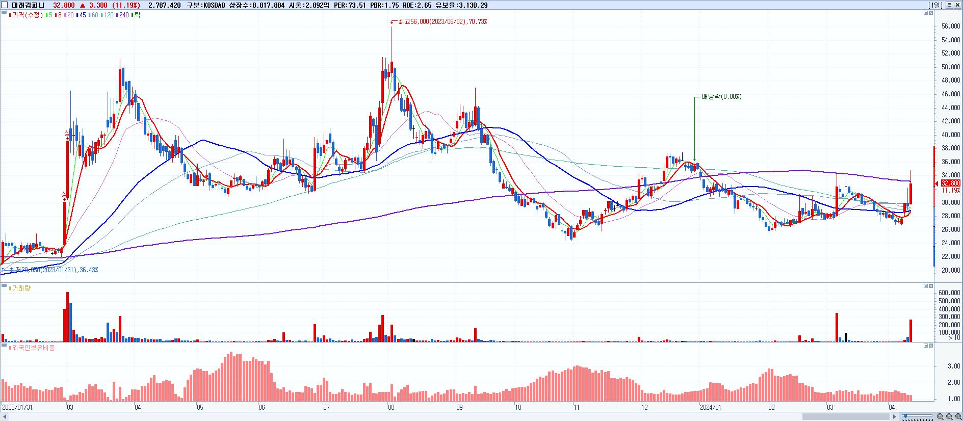 - 미래컴퍼니 (32,800원 ▲ 11.19% , 시총: 2,892억, 거래량: 2,787,420, 거래대금:919억)