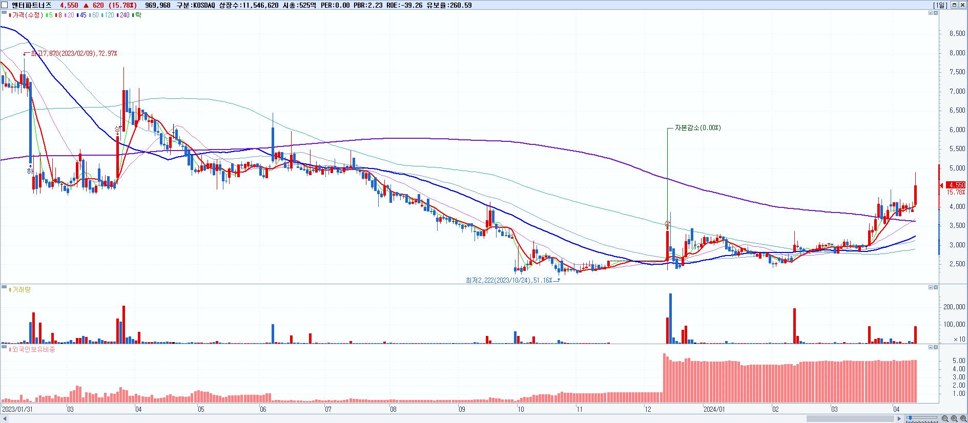 - 엔터파트너즈 (4,550원 ▲ 15.78% , 시총: 525억, 거래량: 969,968, 거래대금:44억)