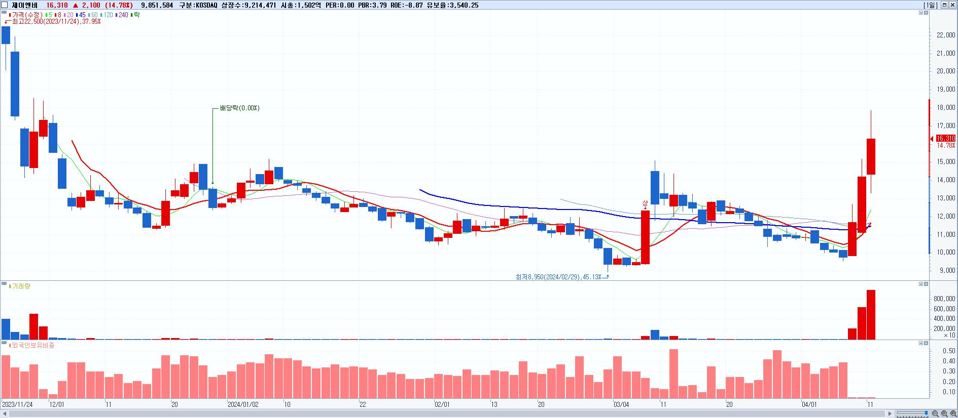 - 제이엔비 (16,310원 ▲ 14.78% , 시총: 1,503억, 거래량: 9,851,584, 거래대금:1,634억)