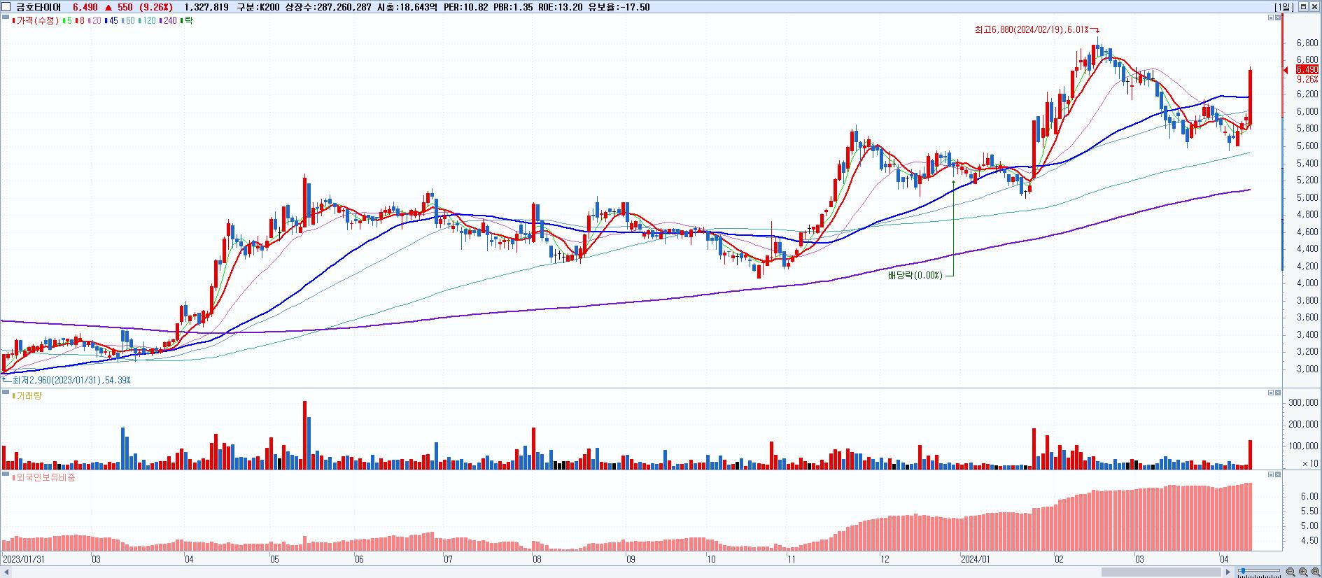 - 금호타이어 (6,490원 ▲ 9.26% , 시총: 18,643억, 거래량: 1,327,819, 거래대금:84억)