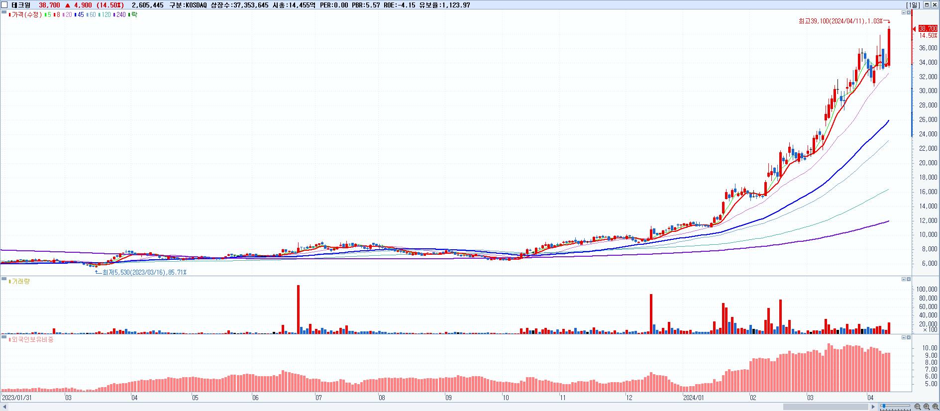 - 테크윙 (38,700원 ▲ 14.5% , 시총: 14,456억, 거래량: 2,605,445, 거래대금:966억)