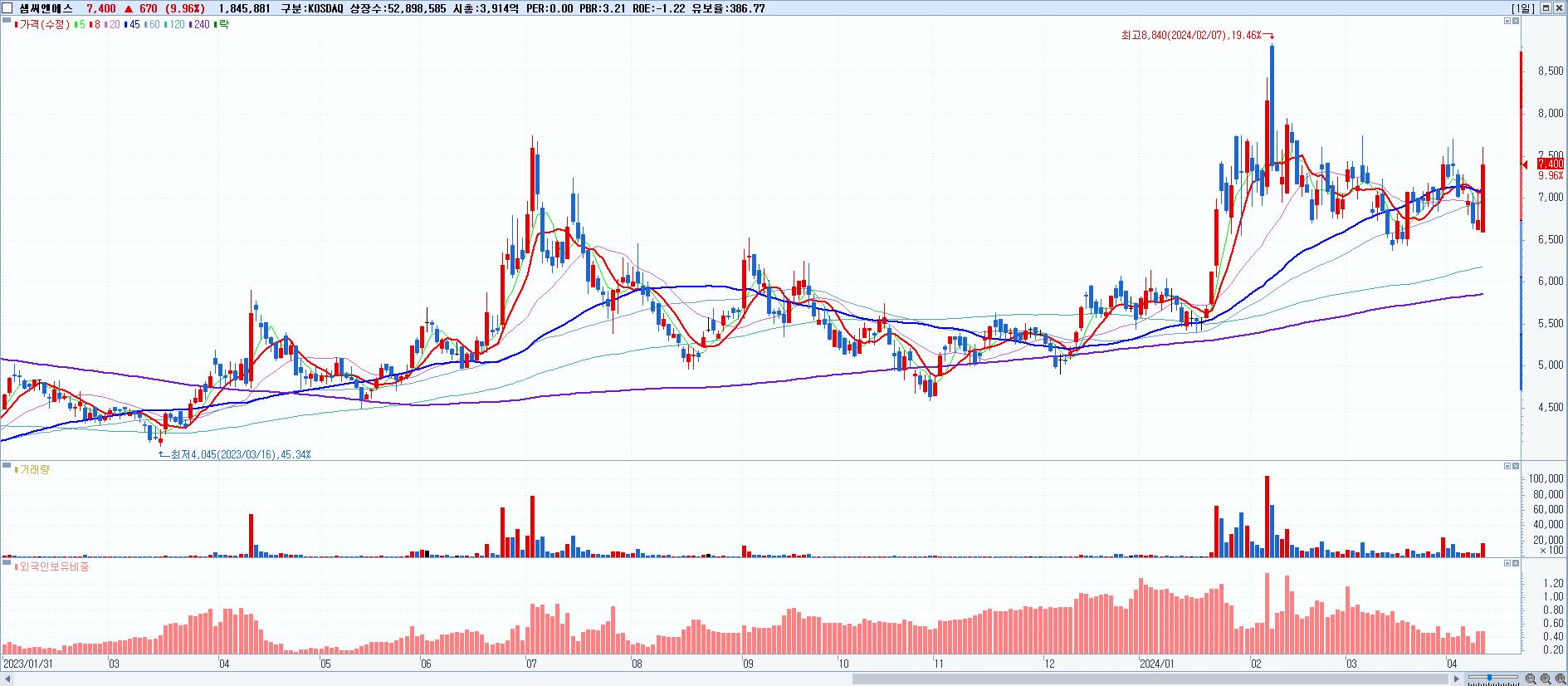 - 샘씨엔에스 (7,400원 ▲ 9.96% , 시총: 3,914억, 거래량: 1,845,881, 거래대금:136억)