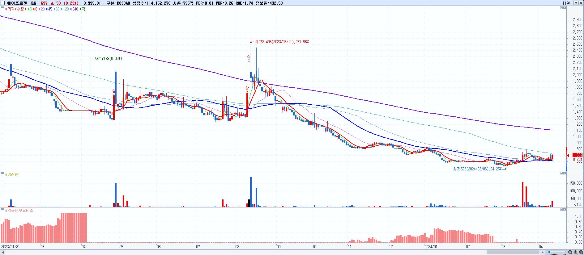 - 에이프로젠 H&G (697원 ▲ 8.23% , 시총: 796억, 거래량: 3,999,011, 거래대금:28억)