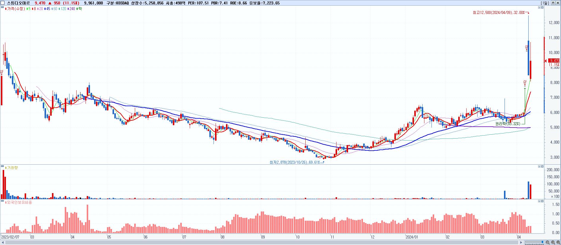 - 스튜디오미르 (9,470원 ▲ 11.15% , 시총: 498억, 거래량: 9,961,000, 거래대금:993억)