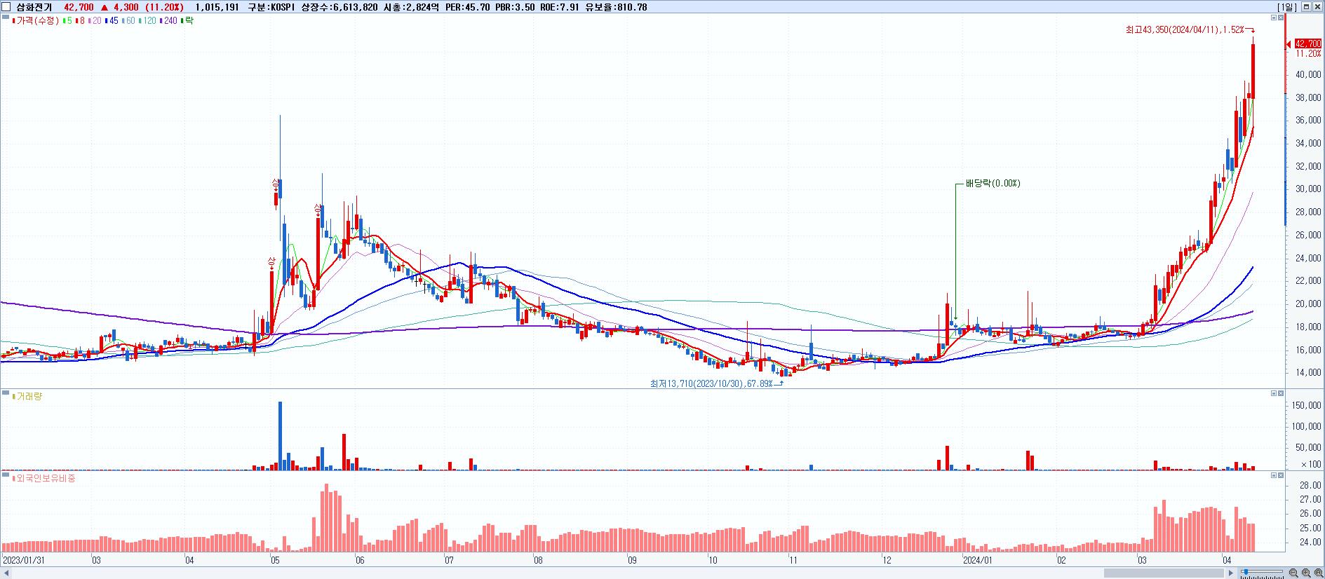 - 삼화전기 (42,700원 ▲ 11.2% , 시총: 2,824억, 거래량: 1,015,191, 거래대금:398억, KOSPI)