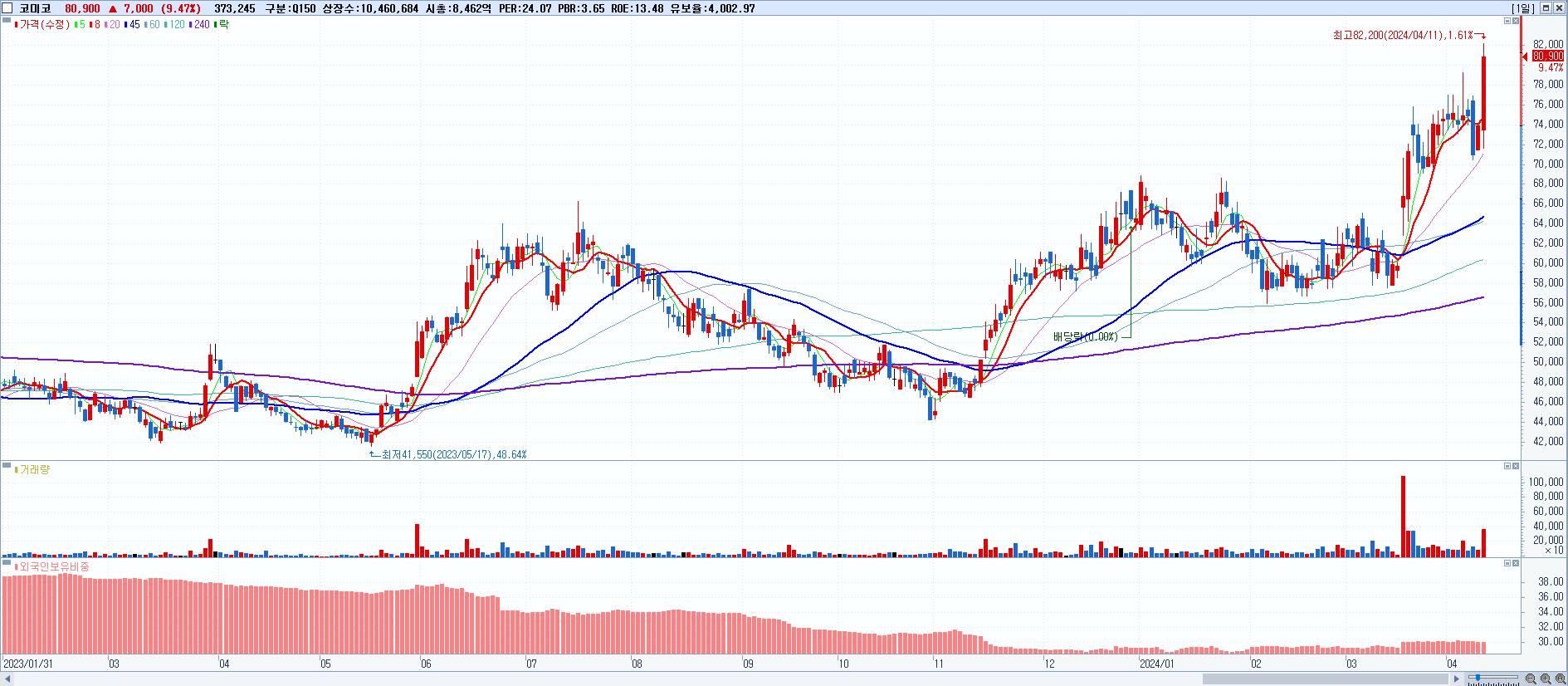 - 코미코 (80,900원 ▲ 9.47% , 시총: 8,463억, 거래량: 373,245, 거래대금:293억, KOSDAQ)
