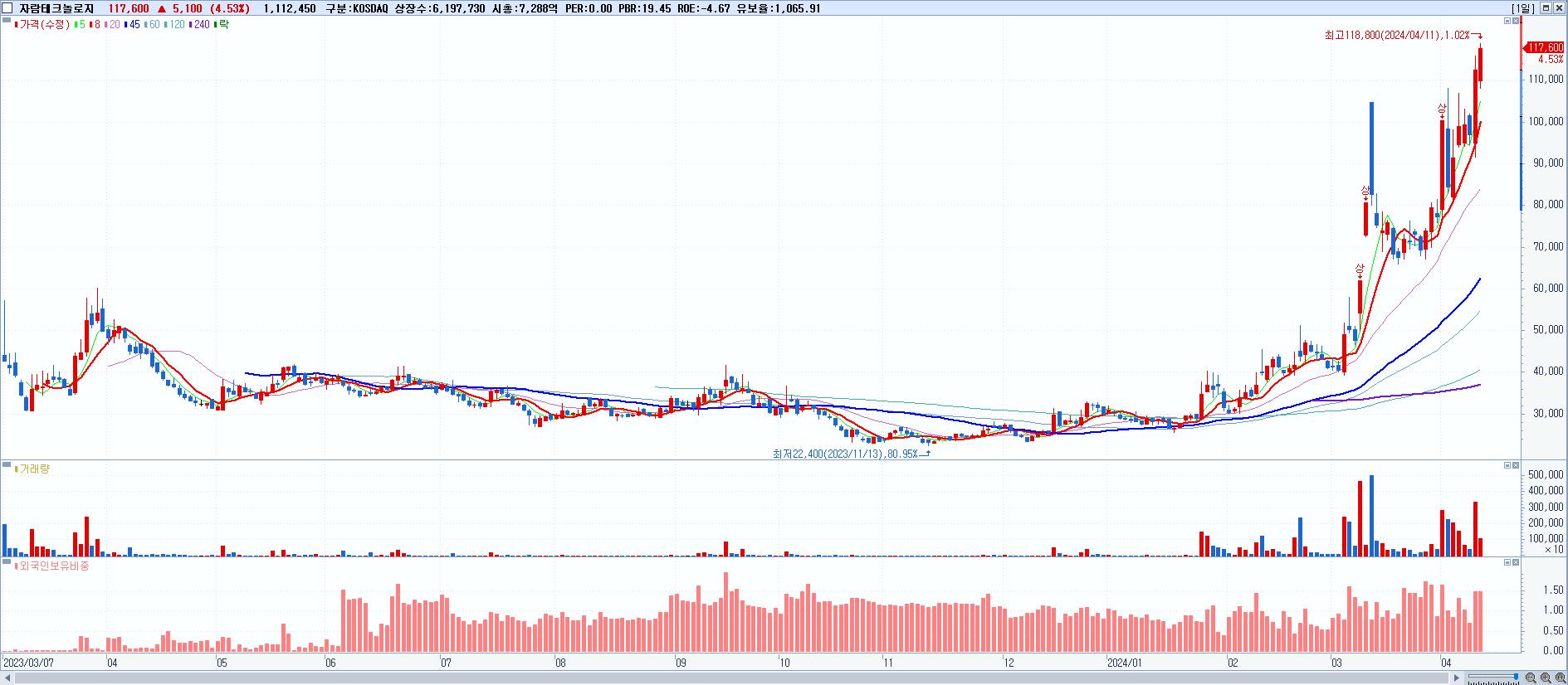 - 자람테크놀로지 (117,600원 ▲ 4.53% , 시총: 7,289억, 거래량: 1,112,450, 거래대금:1,273억, KOSDAQ)