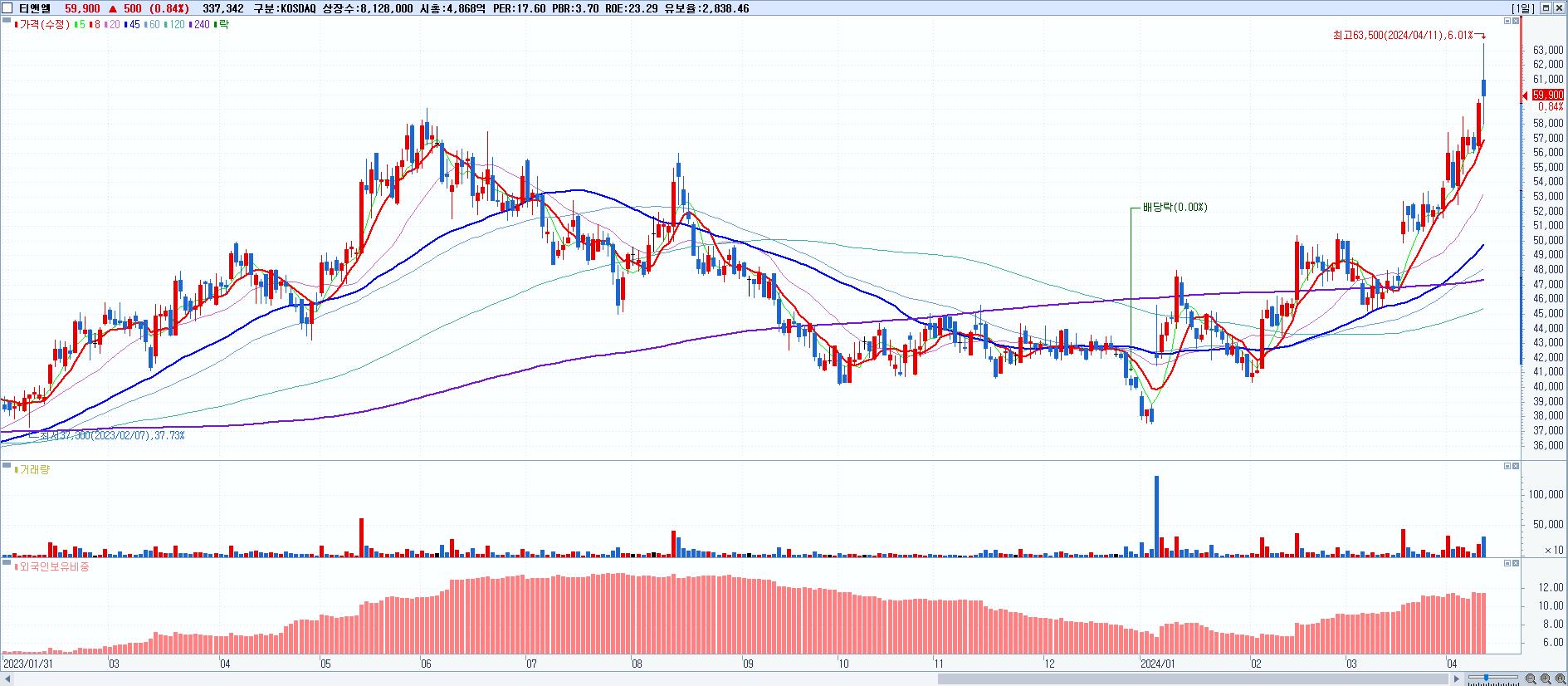 - 티앤엘 (59,900원 ▲ 0.84% , 시총: 4,869억, 거래량: 337,342, 거래대금:206억, KOSDAQ)