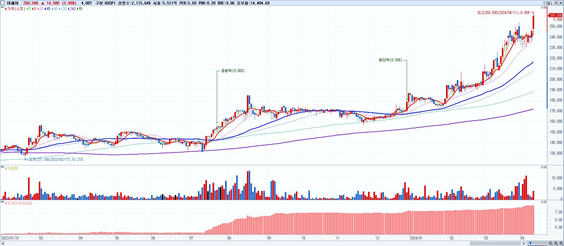 - 아세아 (260,500원 ▲ 5.89% , 시총: 5,511억, 거래량: 4,087, 거래대금:10억, KOSPI)